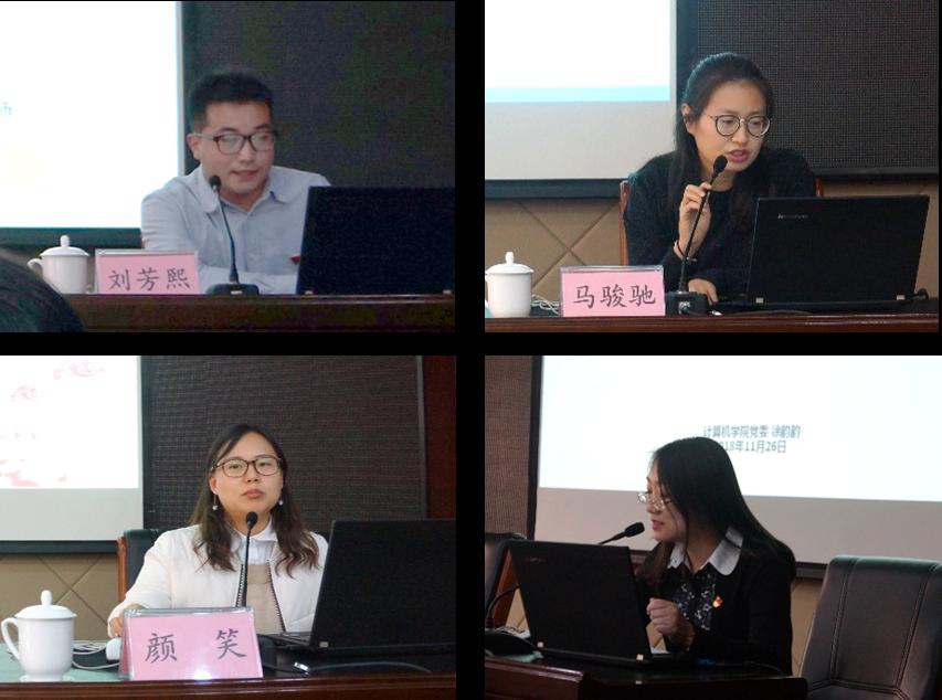 机械与车辆学院组织干事刘芳熙、信息与电子学院组织干事马骏驰、人文与社会科学学院辅导员颜笑、计算机学院组织干事徐韵韵分别作了题为“基层组织建设与学生思政”“信息与电子学院党建特色工作”“做新时代特色的学生党建工作”和“不要人夸颜色好只留清气满乾坤”的经验交流。