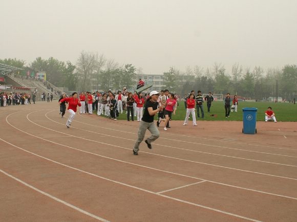 有趣的抱球跑迎面接力获第二名(黄色衣为机关队)