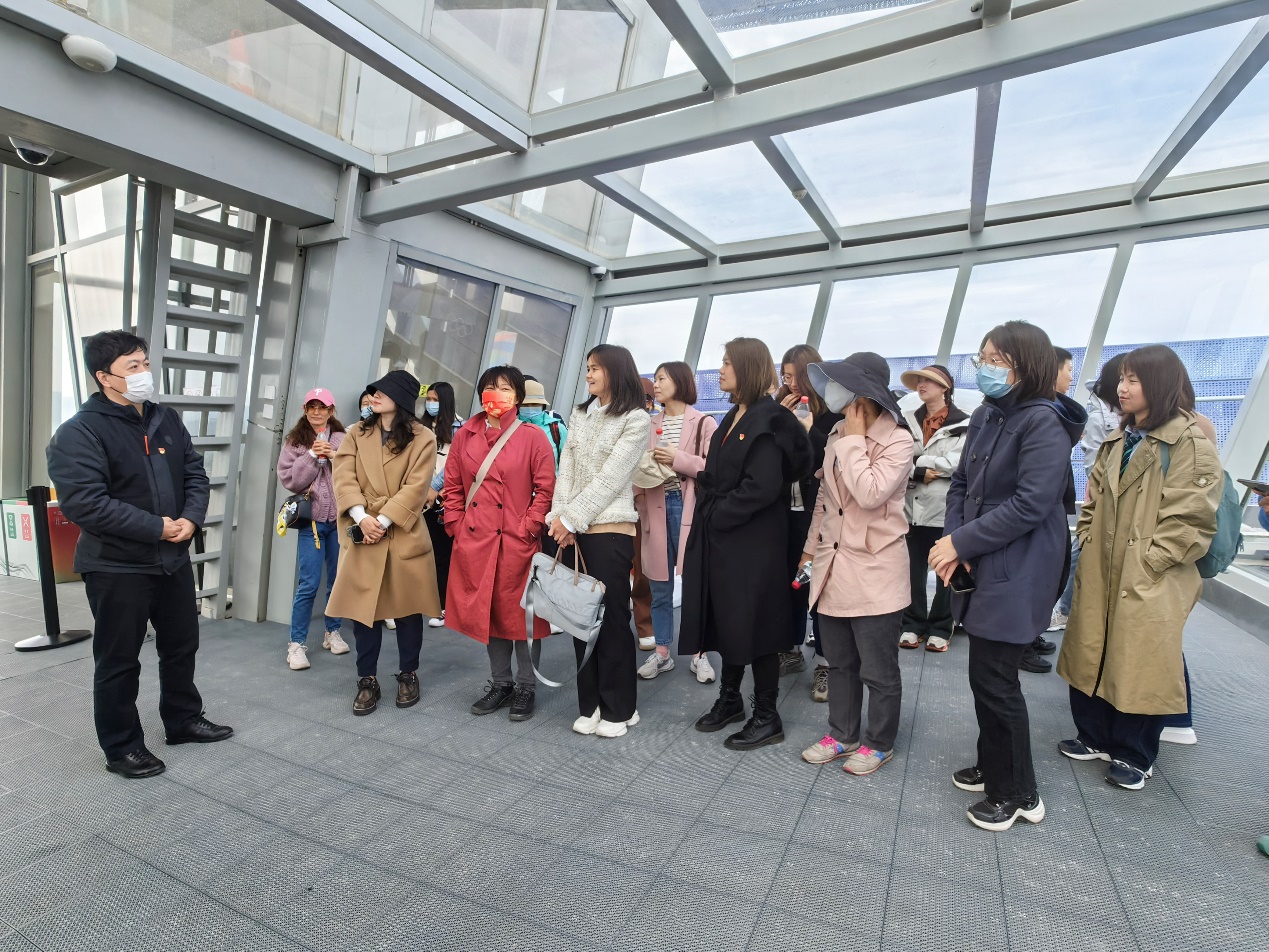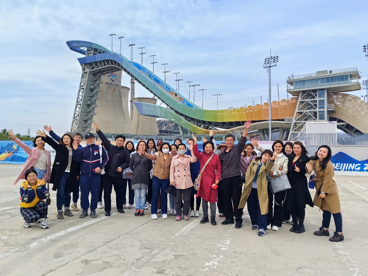 活动首先参观了北京冬奥会的标志性建筑——首钢滑雪大跳台。这是冬奥与工业遗产再利用相结合的竞赛场馆,并且是2022年冬奥会雪上项目唯一一个坐落于北京市内的竞赛场馆,也是该项运动世界上首个永久性比赛场馆。大家乘坐国内首屈一指的斜行电梯登上滑雪大跳台出发区,学生事务中心副主任马晓宁结合自身冬奥会项目经理的经历和场馆故事,让大家近距离深切地感受奥林匹克精神。大家纷纷拿起相机,记录下与冬奥冠军“同台”的美好瞬间。